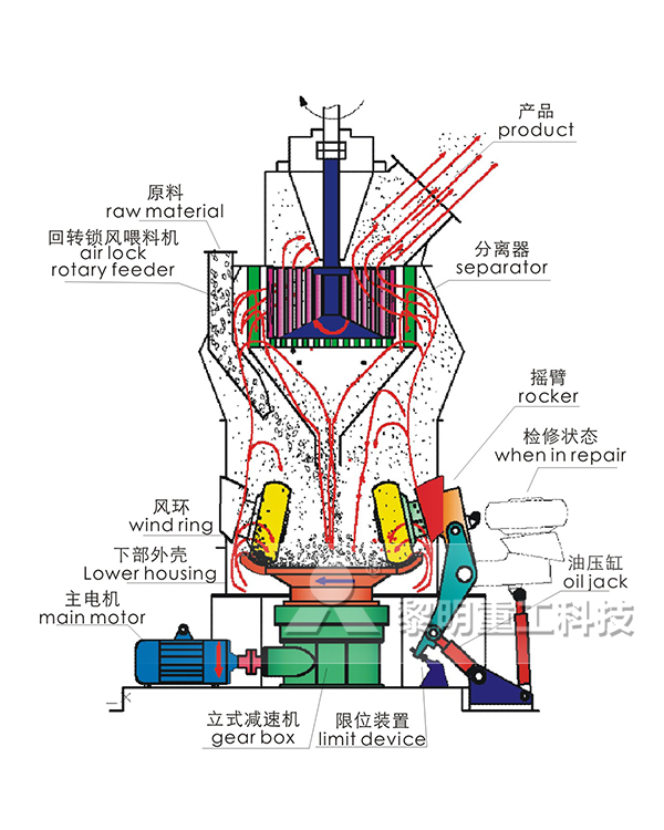 由熱風(fēng)爐出來的熱風(fēng)或廢氣,在系統(tǒng)風(fēng)機(jī)的抽引下,進(jìn)入立式磨煤機(jī),與磨內(nèi)被粉磨的原煤進(jìn)行充分熱交換后,帶起煤粉在分離器處進(jìn)行分選,細(xì)度不合格的粗煤粉重新落到磨盤上進(jìn)行粉磨,合格的煤粉隨氣流進(jìn)入防爆氣箱脈沖收塵器被收集下來,經(jīng)過分格輪卸入煤粉倉。 原煤中的雜物,如部分煤矸石、金屬塊等,通過風(fēng)環(huán)、吐渣口排除磨外。
