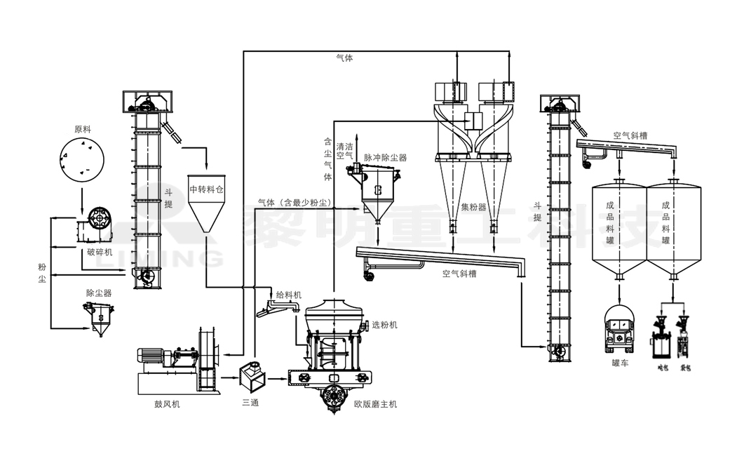 歐版磨粉機(jī)作為一種節(jié)能裝備,其技術(shù)特點(diǎn)是單機(jī)生產(chǎn)能力大、易于規(guī)?;a(chǎn)、單位產(chǎn)品能耗低、易于維護(hù)等,一次成品細(xì)度d97=800~400目(200~38um),單機(jī)生產(chǎn)能力依機(jī)型不同在6~50T/H,其工藝流程圖見圖.