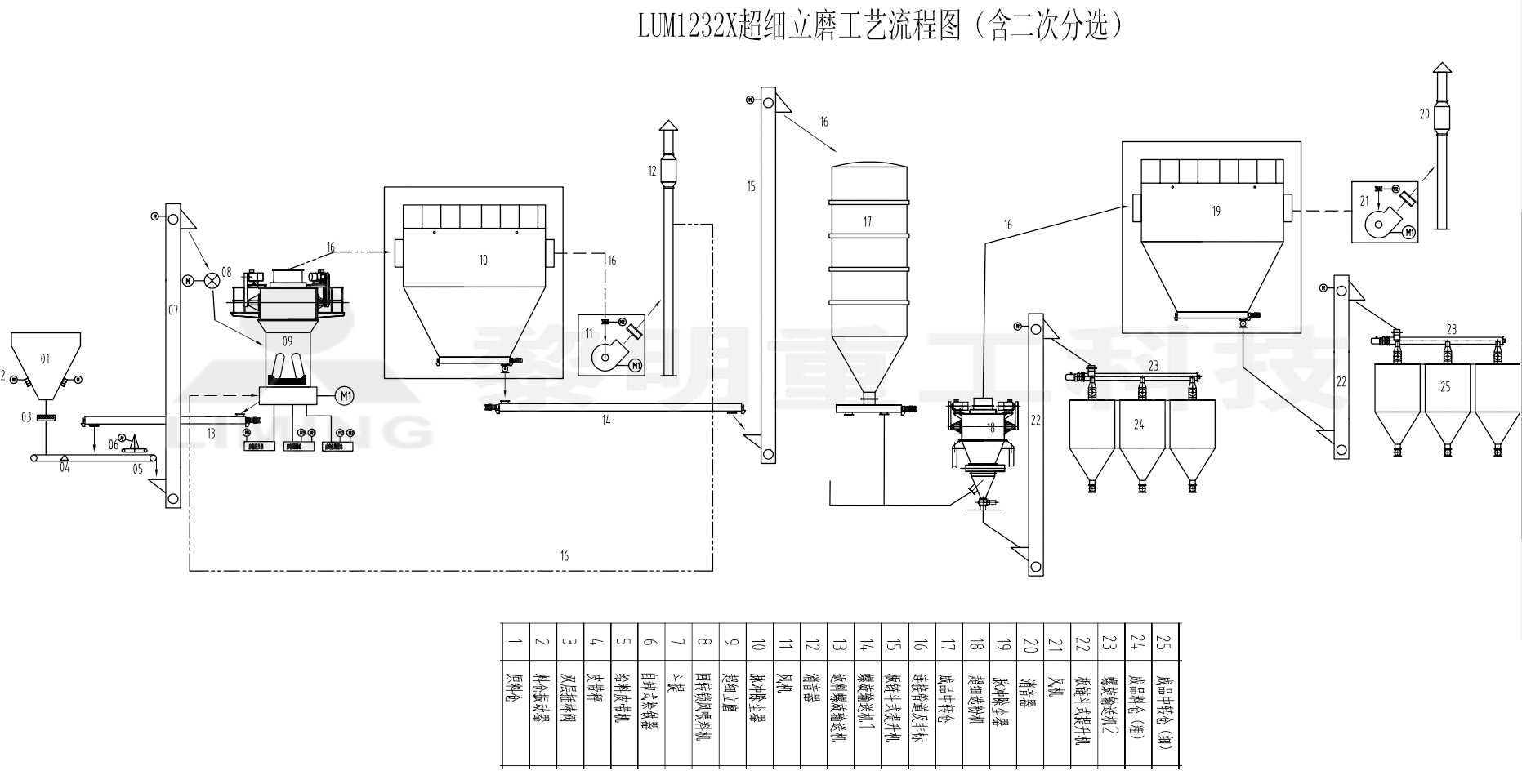 生產(chǎn)該系度范圍的重鈣主要選用超細(xì)立磨,LUM系列超細(xì)立式磨是黎明重工結(jié)合多年的各種磨機(jī)研發(fā)制造經(jīng)驗(yàn),以LM系列立式磨為基礎(chǔ),借鑒的德國(guó)超細(xì)立磨的相關(guān)技術(shù),設(shè)計(jì)開發(fā)的科學(xué)性粉磨設(shè)備,是一種一次完成超細(xì)粉磨、分級(jí)、輸送于一體的超細(xì)制粉行業(yè)專用設(shè)備,漆工藝參數(shù)、機(jī)械性能及成品質(zhì)量等技術(shù)指標(biāo)達(dá)到標(biāo)準(zhǔn)水平。該機(jī)可直接粉磨生產(chǎn)650目的重鈣,通過增加二次分級(jí)裝置,可生產(chǎn)1500目的超細(xì)重鈣。該機(jī)主要應(yīng)用于超細(xì)碳酸鈣的粉碎加工,一次成品細(xì)度d97=400~1500目(8~38um),單機(jī)生產(chǎn)能力依機(jī)型不同在8~18T/H,其工藝流程圖看圖。