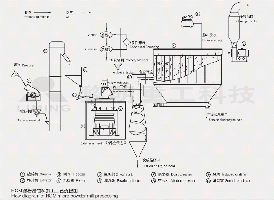 HGM環(huán)輥微粉磨主要包括:主機、選粉機、擴散式旋風集粉器、高壓風機、消聲器等。根據(jù)工藝要求可選配破碎機、提升機、儲料倉給料裝置等輔助配套設備。