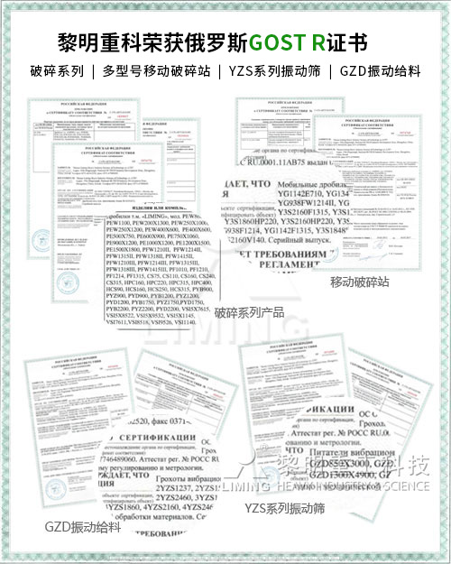 近日,黎明重工科技破碎磨粉系列的百余種型號(hào)產(chǎn)品通過了俄羅斯質(zhì)量認(rèn)證—GOST認(rèn)證,成為繼CE認(rèn)證后的第二個(gè)國際質(zhì)量認(rèn)證。
