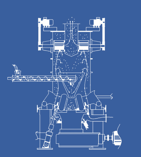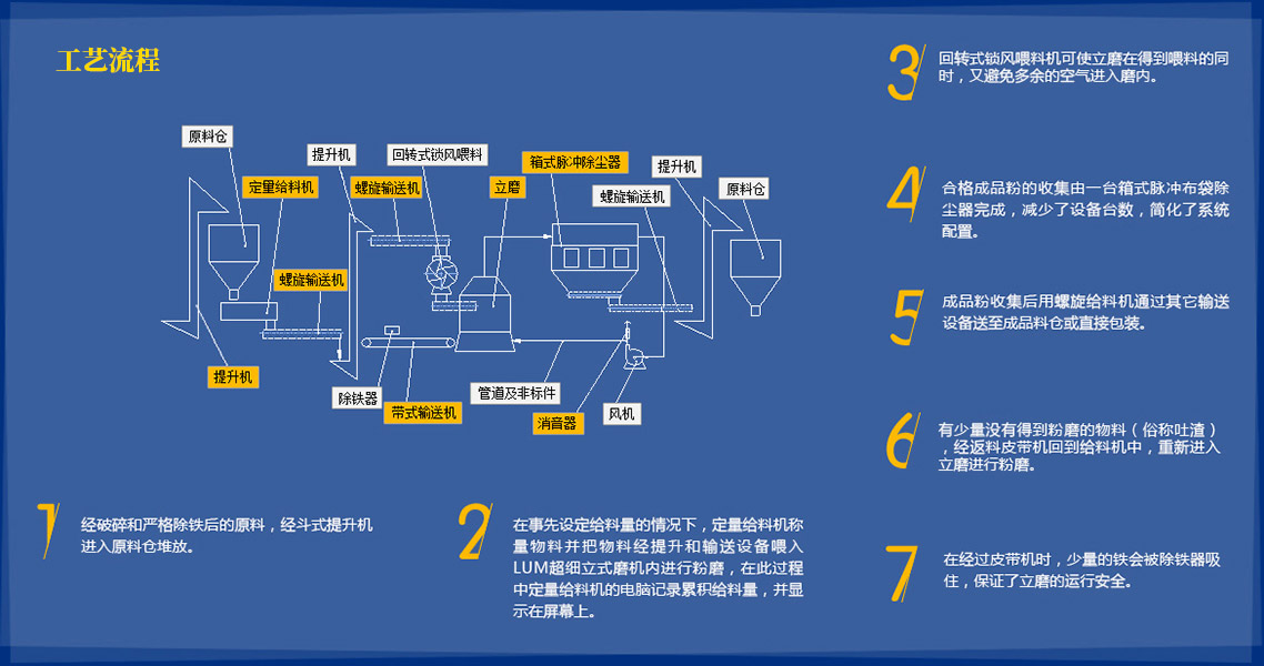 主電機(jī)通過減速機(jī)帶動(dòng)磨盤轉(zhuǎn)動(dòng),同時(shí)風(fēng)從進(jìn)風(fēng)口進(jìn)入LUM超細(xì)立式磨機(jī),物料經(jīng)螺旋給料機(jī)下料口落在磨盤,在離心力的作用下,物料從磨盤向邊緣均勻移動(dòng),經(jīng)過磨盤上的粉磨輥道區(qū)域時(shí),受到磨輥的碾壓,大塊物料直接被壓碎,細(xì)粒物料受擠壓后形成料床進(jìn)行粒間粉碎。被粉碎的物料繼續(xù)向磨盤邊緣移動(dòng),直到被風(fēng)環(huán)處的強(qiáng)氣流帶走,而較大的顆粒物料又重新掉落到磨盤上繼續(xù)粉碎,氣流中的物料經(jīng)過上部的分離器時(shí),在轉(zhuǎn)子葉片的作用下,粗顆粒重新回到磨盤上粉磨,合格的細(xì)粉隨氣流一起出磨,被系統(tǒng)的集粉器收集,被收集到的粉料即為超細(xì)立磨磨出的產(chǎn)品?;烊胛锪系蔫F塊等雜物隨物料運(yùn)動(dòng)到磨盤邊緣時(shí),由于自身重量大而不能被風(fēng)吹起,跌落至磨機(jī)下腔被安裝在磨盤底部的刮料板刮入排渣口排出機(jī)外。