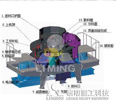 中心進(jìn)料伴隨環(huán)形瀑落進(jìn)料:物料落入制沙機進(jìn)料斗,在經(jīng)環(huán)形孔落下,被分料板分成兩股料,一股經(jīng)分料盤進(jìn)入高速旋轉(zhuǎn)的甩輪,另一股從分料盤四周落下。進(jìn)入甩輪的物料,在甩輪內(nèi)被迅速加速,其加速度可達(dá)數(shù)十倍重力加速度,然后高速從甩輪內(nèi)拋出,首先同由分料器四周自由落體的另一部分物料沖擊破碎,然后一起沖擊到渦流腔內(nèi)渦流襯層上,被物料襯層反彈,斜向上沖擊到渦流腔的頂部,又改變其運動方向,偏轉(zhuǎn)向下運動,又與從葉輪流道發(fā)射出來的物料撞擊形成連續(xù)的物料幕。這樣,一塊物料在渦流破碎腔內(nèi)受到兩次至多次幾率撞擊、摩擦和研磨破碎作用,被破碎的物料由下部排料口排出。